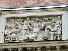 Над колоннадой предполагалась установка скульптур, но в реализованном варианте она увенчана только обелисками. Рельефы над колоннами изображают различные виды музыкальных искусств.