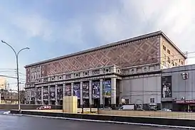 Архитектура главного фасада основана на сопоставлении глухой плоскости стены (с геометрическим орнаментом из терразитовой штукатурки), со стоящей впереди колоннадой, акцентирующей главные входы в здание.