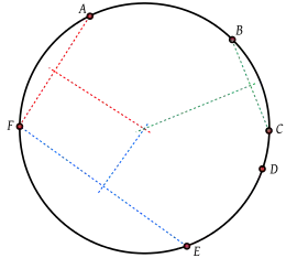 В общем случае центр O окружности, на которой лежат точки P и Q, должен быть таким, чтобы расстояния OP и OQ были равны . Поэтому точка O должна лежать на срединном перпендикуляре (или на медиатрисе) отрезка PQ.[2]. Необходимым и достаточным условием того, чтобы n различных точек лежали на одной окружности является то, что n(n − 1)/2 медиатрис отрезков, имеющих своими концами любые пары из n точек, все одновременно пересекались в одной точке, а именно: в центре O.