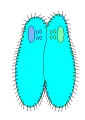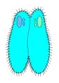 - Тесно сблизившиеся половые партнёры — вегетативные клетки образуют относительно узкий цитоплазматический мостик, соединяющий обе клетки, однако полного слияния клеток не происходит (клетки сближаются сторонами, на которых находится клеточный рот[3]).