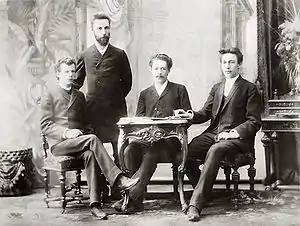 ![]() Лев Конюс (крайний слева) вместе со своим учителем Антоном Аренским и соучениками Никитой Морозовым и Сергеем Рахманиновым | |