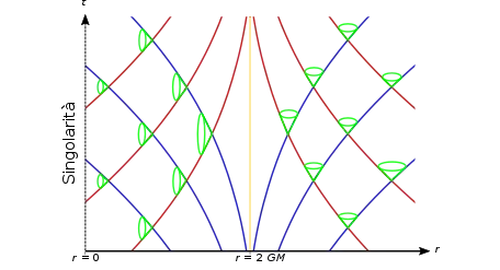 имеют v(τ) → −∞ по мере того, как τ → 2GM. То есть, эта времениподобная геодезическая имеет конечную собственную длину в прошлое, где она выходит из горизонта (r = 2GM), когда v стремится к . Области для конечных v и r < 2GM отличаются от конечных u и r < 2GM. Горизонт r = 2GM и конечный v (горизонт чёрной дыры) отличаются от горизонта с r = 2GM и конечным u (горизонт белой дыры).
