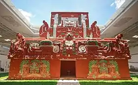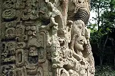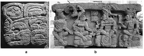 ![]() a) Титул царей Копана; b) Цари Копана на Алтаре Q (Цари 2, 1, 16 и 15) |