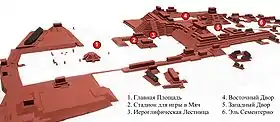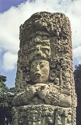 Кроме великолепных стел, возведённых в честь 15-го двадцатилетия царём Вашаклахун-Убах-К’авилем в 731 г. и изображающих самого царя, его предков, а также богов-хранителей долины (известной в древности как Хушвинтик), внимание посетителей Главной Площади привлечет стадион для игры в мяч, украшенный изображениями попугаев-ара, а также величественная иероглифическая лестница, заложенная при Вашаклахун-Убах-К’авиле, перестроенная и увеличенная при 15 царе, К’ак'-Йипйах-Чан-К’авиле. Эта лестница — самая длинная известная нам надпись на памятниках древних майя (около 2 страниц печатного текста латиницей). К сожалению, только первые 15 из 63 ступеней лестницы были найдены в своем первоначальном состоянии, тогда как остальные были восстановлены археологами Института Карнеги в полном беспорядке.