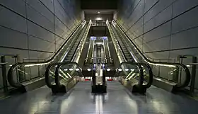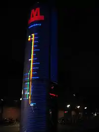 Указателем на станцию метро является установленная на поверхности информационная колонна. Высота колонны 5 метров, что обеспечивает её видимость издалека. Практически всю часть колонны занимает электронный дисплей, где содержится информация о предыдущих и следующих станциях линии. Дизайн колонны разработан студией «Knud Holscher Industriel Design»[16].