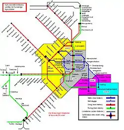 | Линия | Название | Цвет | Маршрут | Годы открытия новых участков | Длина | Станции | |