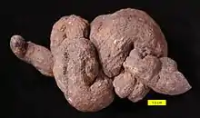 Копролитами (каловыми камнями) также называются одиночные или множественные конкременты шаровидной или овальной формы, возникшие в толстой кишке при продолжительных запорах, аномалиях развития толстой кишки (к примеру, при мегаколоне) вследствие уплотнения каловых масс. Диаметр может достигать 10-15 см, нередко пропитаны неорганическими солями. Также встречаются энтеролиты, возникающие в тонкой кишке, разрастаясь вокруг желчного камня, остатков пищи, волос, медикаментозных средств. У пациентов могут вызывать боль, чувство тяжести в животе, изъязвления, пролежни, папилломатозы, обтурационную кишечную непроходимость, перфорацию стенки, кишечные кровотечения. Удаление — стимуляцией естественного пути выхода либо хирургическое[1]. Копролиты в червеобразном отростке могут быть причиной аппендицита[2].