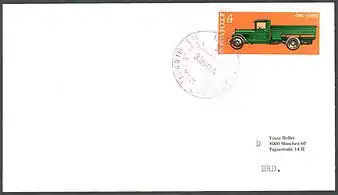 Конверт письма, отправленного пироскафом «Александра» из Петербурга в Любек и далее доставленного сушей в Берлин (1838). Пароходная компания, обслуживавшая маршрут до Любека, сделала на письме пометку типа B1 — в виде буквы «R» (от нем. «Russland» — «Россия»)