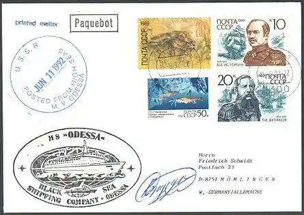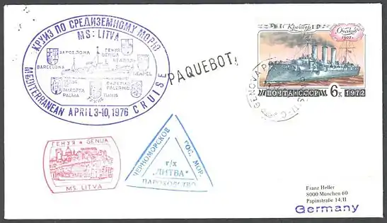 - Примеры конвертов СССР со штампом «Paquebot» («Пакетбот»)
