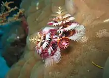 В море обитают многочисленные виды анемонов, губок, червей (например, Spirobranchus giganteus, показанный на фотографии), брюхоногих моллюсков, омаров, креветок и крабов. Красные водоросли Lithothamnion и Porolithon цвета многие коралловые рифы пурпурно-красные и зеленые водоросли Halimeda встречается по всему морю. Прибрежные растения, состоящие всего из 30-40 видов, и мангровые заросли встречаются в северной части моря.[13] Четыреста видов кораллов, как твердых, так и мягких населяют рифы.[21]