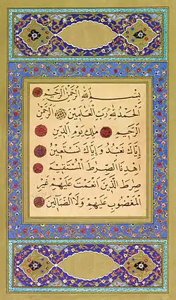 Все суры Корана, кроме девятой, начинаются словами: «Во имя Аллаха, Милостивого, Милосердного». В первой суре Корана эти слова включены в текст в качестве первого аята[1].