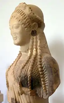 Сложные одеяния, принадлежностью которых был короткий косой хитончик, наброшенный на грудь, скрывают пластику тела, но уже в 30-х годы VI века до н. э. у кор появились строгие дорийские уборы — пеплосы, которые станут основным одеянием классического периода. Формы тела становятся более крепкими, реальными, а к началу грекоперсидских войн улыбка сбегает с архаических лиц[2].