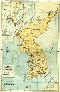 В колониальный период Корея подразделялась на 13 провинций (яп. 道, то). Провинции делились на города областного значения (яп. 府, фу), уезды (яп. 郡, гун) и острова (яп. 島, то)[15]. Более мелкими административными единицами были район (яп. 面, мэн) и селение (яп. 邑, ю:). Районы и селения, в свою очередь, подразделялись на кварталы (яп. 洞 то:) и деревни (яп. 里, ри).