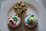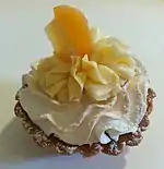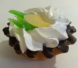 Корзи́ночка — пирожное в виде корзинки из песочного теста, наполненной повидлом или джемом и залитой белковым или заварным кремом[2], сверху может быть украшено съедобной фигурой из безе и теста[3][4][5][6]. В качестве альтернативы джему может использоваться сгущённое молоко или другая сладкая начинка[7][8][9].