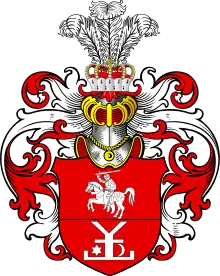 Красный щит пересечен. В верхнем поле скачущий всадник (Погоня), в нижнем: фигура вроде латинской буквы игрек (Y), перекрещенная в средине, а основанием своим упирающаяся в скобу с загнутыми концами; справа от этой эмблемы помещается шестиугольная звезда, а слева полумесяц (Курч).