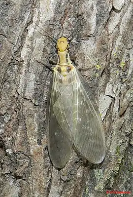 Крупные насекомые, с длиной переднего крыла у самцов 22—30 мм, самок 20—30 мм. Цвет тела головы и груди от желтоватого до желто-коричневого, дорсальная часть головы в затылочной области с двумя парами крупных черных боковых пятен и парой сублатеральных небольших пятен. Сложные глаза черно-коричневые; три глазка, расположенные в центре головы за антеннами, желтые с черным внутренним краем, средний глазок расположен поперечно и уплощен; расстояние между глазками чуть меньше расстояния между основаниями антенн. Антенны темные, с желтоватыми скапусом и педиселом. Постокулярный вырост присутствует, но слабо развит. Ротовые органы желтоватые; мандибулы в апикальной части черновато-коричневые. Грудь желтовато-коричневая; переднегрудь с двумя парами латеральных крупных пятен; средне- и заднегрудь светло-коричневатая латерально. Переднегрудь намного длиннее средне- и заднегруди. Ноги желтые с короткими, густыми желтоватыми щетинками; голень и лапка светло-коричневые; коготки лапки красновато-коричневые. Передние крылья палево-коричневые, полупрозрачные с крупными желтоватыми пятнами от основания к середине крыла. Брюшко от желтого до коричневого.[3]