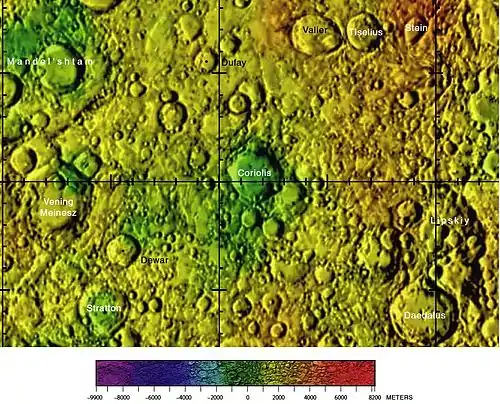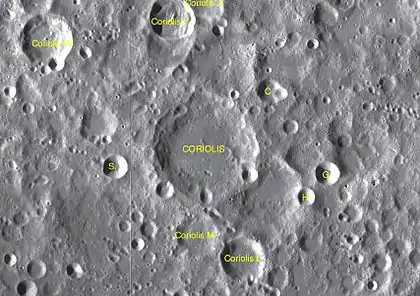 - Образование сателлитного кратера Кориолис Y относится к эратосфенскому периоду[1].