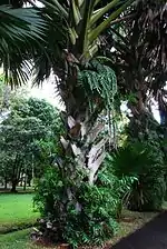 ![]() Корифа зонтоносная: сухие листья — посередине, зелёные листья — выше, и громадное белое соцветие — на верхушке | ||||||||||||||