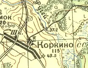 Согласно военно-топографической карте Петроградской и Новгородской губерний издания 1917 года, деревня Коркино состояла из 35 крестьянских дворов[7].