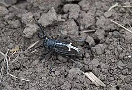 Усики и ноги черные. Голова покрыта в белых или грязно-белых, либо буроватых волосках. Переднеспинка покрыта бурыми волосками, не образующими сплошного покрова, но расположенными более или менее пятнисто. Надкрылья в темно-буром, чёрно-буром или почти черном волосяном покрове с белой или грязно-белой крестообразной фигурой. Данный рисунок надкрылий очень сильно изменчив. Многие формы свойственны обоим полам[4].