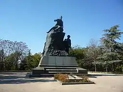 Памятник Корнилову на месте его смертельного ранения. Внизу справа матрос РИФ Пётр Кошка
