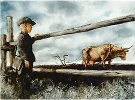 У нас была корова. Когда она жила, из неё ели молоко мать, отец и я. Потом она родила себе сына — телёнка, и он тоже ел из неё молоко, мы трое и он четвёртый, а всем хватало. Корова ещё пахала и возила кладь. Потом её сына продали на мясо. Корова стала мучиться, но скоро умерла от поезда. И её тоже съели, потому что она говядина. Корова отдала нам всё, то есть молоко, сына, мясо, кожу, внутренности и кости, она была доброй. Я помню нашу корову и не забуду.