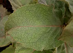 Прикорневые листья сидячие или на черешках 2—5 см длиной, в несколько раз короче пластинки. Пластинка прикорневых листьев 10—40 см длиной, 4—10 см шириной, продолговатая или продолговато-эллиптическая, крупногородчатая по краю, к основанию постепенно суженная.