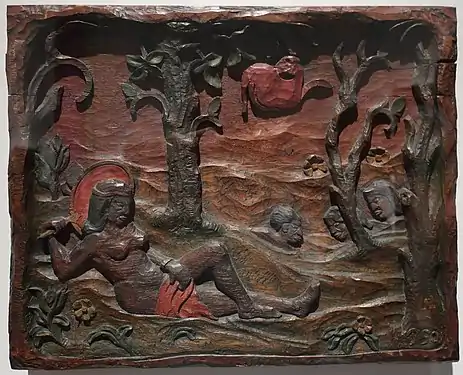 Впервые Гоген изобразил подобную фигуру девушки с веером в 1889—1890 году в рельефе, вырезанном на дубовой доске, «Лежащая женщина с веером» из собрания Новой глиптотеки Карлсберга. В этом рельефе Гоген проводит явные параллели с Евой: с дерева свисает большое красное яблоко и видна голова змея-искусителя.