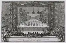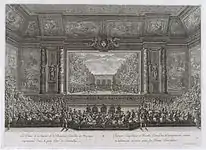 | «Премьера комедийного балета Принцесса Наваррская 23 февраля 1745 года в Манеже Больших Конюшен по случаю бракосочетания Дофина и Инфанты Марии-Терезии Испанской; гравюра Шарль-Николя Кочина» (младшего), 1715—1790. | «„Акид и Галатея“, постановка на сцене театра, сооруженного на Лестнице Послов в Версале (23 января — 10 февраля 1749.» Адольф Лалюз, 1838—1906. | «Маскарад, устроенный Королём в Манеже Больших Конюшен в Версале по случаю бракосочетания Дофина и Инфанты Марии-Терезии Испанской (24 февраля 1745).» Гравюра Шарль-Николя Кочина (младшего), 1715—1790. |