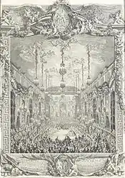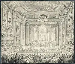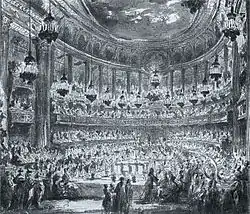 Зал Версальской Оперы во время празднования бракосочетания Дофина и Марии-Антуанетты в 1770 году. Жан-Мишель Моро (1741—1814). |
