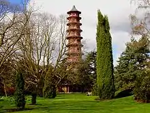 Великая пагода, возведённая в 1762 году по проекту Уильяма Чемберса, по форме подражает китайскому архитектурному стилю Та. Нижний из десяти восьмиугольных этажей в поперечнике имеет 49 футов (15 м). Высота здания от основания до самой высокой точки — 163 фута (50 м).