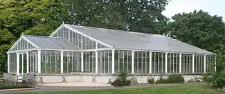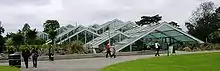 Пальмовый дом (1844—1848) — оранжерея из стекла и кованого железа, созданная архитектором Децимусом Бёртоном и металлургом Ричардом Тёрнером[32]. Строение воплощает в стекле принципы проектирования, разработанные Джоном Лоудоном и Джозефом Пакстоном[33], — стёкла держатся на каркасе из кованых арок, скреплённых между собой горизонтальными трубами, внутри которых протянуты тросы[34]. Стёкла тонированы окисью меди в зеленоватый цвет для предохранения растений от перегрева[35]. 19-метровый центральный неф окружён дорожкой на высоте 9 м, что позволяет посетителям рассматривать кроны находящихся в теплице пальм. В 1958 году перед Пальмовым домом (с восточной стороны) размещены 10 статуй животных, выполненные из портлендского камня, — копии скульптур Джеймса Вудфорда[36].