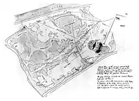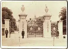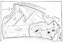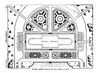 План Садов Кью в разные годы. Слева направо: 1845 (эскиз планировки и план Пальмового дома, рисунок и чертёж Уильяма Несфилда); 1896. Главный вход. 1800-е годы | ||||||||||