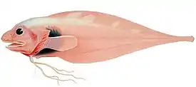 Длина взрослых рыб 25—28 см, наибольшая длина 29,7 см. Голова крупная, толстая, сжатая с боков. Щеки вертикальные. Тело сжато с боков и сильно суживается к хвосту. Рыло несколько выдается вперед. Обе пары ноздрей имеют вид открытых пор. Жаберные отверстия очень крупные, достигают основания брюшных нитей. Верхняя лопасть грудного плавника образована 11—12 лучами. Нижняя лопасть нитевидная, двух- или трёхветвистая. Берёт начало на груди и образована 5 лучами — 2 длинных и 3 нижних рудиментарных. Тело у живых рыб полупрозрачное, окраска его варьируется от светло-красного до светло-фиолетового. Мальки бесцветные. Брюшина чёрного цвета[2].