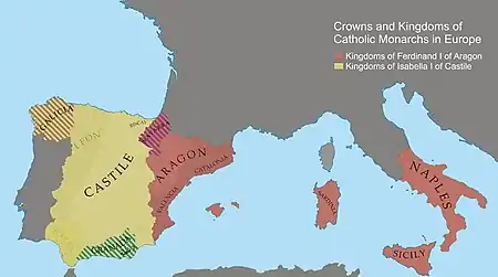 - 1479—1516: Фердинанд II Католик (10 марта 1452 — 25 января 1516), король Арагона, Валенсии, Майорки, Сицилии, Сардинии и Корсики, граф Барселоны, Жероны, Осона, Безалу, Пальярс-Хуссы, Руссильона и Сердани с 1476, король Кастилии и Леона в 1475—1504, регент Кастилии и Леона с 1506, король Неаполя с 1503, сын предыдущего[2][28].