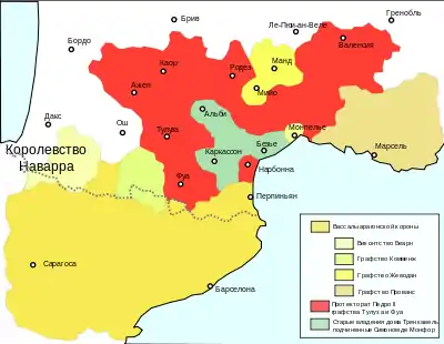 К 1209 году ситуация в Южной Франции накалилась. Отношения провансальской знати с папой и до этого были весьма натянутыми, поскольку она не стремилась искоренять альбигойскую ересь, которая была распространена в регионе, но теперь они обострились до крайности. В результате папа в 1209 году призвал к крестовому походу против окситанской знати, в первую очередь против графа Тулузы Раймунда VI, женатого на сестре Педро, и Раймунда Роже Транкавеля, виконта Безье, Каркасон (графство) и ряда других владений, вассала Педро. Крестовый поход, получивший название Альбигойского, возглавил французский феодал Симон де Монфор. Крестоносцы захватили принадлежавшие Транкавелю земли, включая Безье и Каркассон, что вызвало недовольство Педро II. В результате он вступил в войну против крестоносцев, которая продолжалась до тех пор, пока при посредничестве папы не был заключён договор, по которому король Арагона признал Симона де Монфора виконтом Безье и Каркассона[1][12].