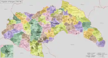 Королевство Венгрия являлось унитарным государством. Территория делилась на 25 комитатов и несколько городов на правах комитата (törvényhatósági jogú város).