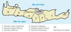 Венецианцы разделили остров на шесть областей (районов), названные в честь районов города Венеция. Острова Тинос и Китира, бывшие под венецианским управлением, были присоединены к Кандийскому королевству. В начале четырнадцатого столетия эти районы были объединены в четыре области, почти идентичные четырём современным префектурам Крита.