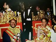 Всего на банкете, состоявшемся вечером того же дня во Дворце Возрождения в Банги, присутствовало около 400 посетителей. Поскольку с наступлением вечера жара в столице постепенно спадала, мероприятие проводилось на открытом воздухе: столы, за которыми сидели приглашённые, располагались на территории обширного, украшенного фонтанами и резьбой по кости, живописного сада, прилегавшего ко Дворцу и в целях безопасности защищённого экранами из пуленепробиваемого стекла[24]. К 9 часам вечера, когда все гости собрались, официанты начали подавать еду, хотя Бокасса, по своему обыкновению, всё ещё опаздывал к столу и появился лишь спустя некоторое время. К этому времени он сменил коронационные одежды и регалии на маршальский мундир и фуражку с кокардой и страусиными перьями, а на пальце императора блестело кольцо с чёрным бриллиантом. Императрица, сопровождавшая его, была одета в длинное французское вечернее платье от-кутюр[23].