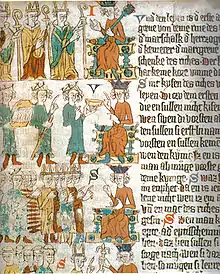 Первое описание возможного хода событий во время средневековой коронации есть у историка Видукинда Корвейского. Он сохранил для потомков историю коронации Оттона I в Ахене. Но, поскольку Видукинд не был свидетелем этого события, исследователи оспаривают тот факт, что описание из его «Деяний саксов» действительно соответствует коронации Оттона I. Предполагают, что у Видукинда представлена стилизация коронационной церемонии как таковой, или же, что кажется более достоверным, в «Деяниях саксов» описывается коронация Оттона II (961—983), на которой историк действительно присутствовал, и, очевидно, спроецировал увиденное на отца этого монарха.