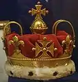 Корона по своему виду похожа на королевскую корону Великобритании: венец, состоящий из чередующихся четырёх крестов и четырёх геральдических лилий, с двумя полудугами, идущими от боковых крестов, венчает которые шар с крестом. В центре — бархатная шапка с горностаевой опушкой.
