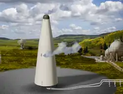 | РН КОРОНА на взлётно-посадочной площадке космодрома (иллюстрация) | РН КОРОНА в орбитальном полёте с закрытым отсеком полезной нагрузки (иллюстрация) |