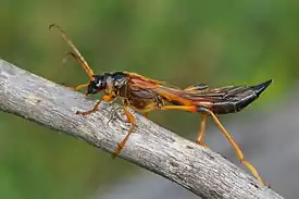 Длина тела взрослых насекомых 21—32 мм[6]. Тело крупное, с параллельносторонней головой, продолговатой переднеспинкой и удлинённым брюшком. Глаза широко выемчатые в мелкой фасетки. Усики не длинные, последними члениками заходят за надкрылья. Надкрылья короткие, лишь чуть длиннее своей ширины. Ноги длинные; задние бёдра булавовидные; задние голени значительно длиннее лапок[6].