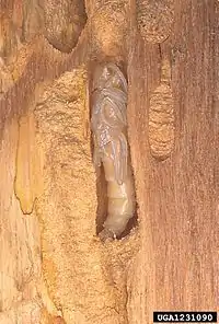 Личинки развиваются внутри древесины, где прокладывают продольные ходы, забивая их мелкой буровой мукой. Ходы прокладываются как во внешнем так и в глубоких слоях древесины. Личинки старшего возраста, готовящиеся к окукливанию, проделывают поперечный ход к поверхности ствола, забивают ход буровой мукой и приступают к устройству куколочной колыбельки, которая длиной 35-40 мм и шириной от 8 до 14 мм. Личинка в колыбельке поворачивается вниз головой и приступает к окукливанию[6].