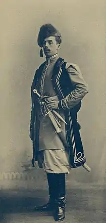 ![]() на костюмированном балу 1903 года (хорунжий Ахтырского Слободского казачьего полка) | |