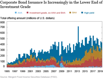 В 1990-х годах американский рынок стал более благоприятным для иностранных инвесторов[7]. Новые выпуски корпоративных облигаций были разделены по рейтинговым категориям и по качеству. Согласно рейтинговым категориям Moody’s Investors Service, здесь можно было наблюдать значительное снижение новых выпусков первоклассных кредитов (Ааа). До наступления 1982 года на две категории с самым высоким рейтингом приходилось свыше 50 % первоначального объема, а после наступления 1982 года — 18,8 новых выпусков облигаций[8].