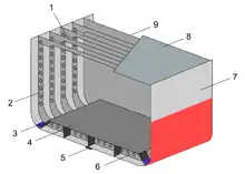 При использовании поперечной системы набора балки главного направления идут поперёк корабля. Они состоят из шпангоутов по бортам (2),[4] флоров (6) по днищу и бимсов (1) под палубой. Шпация, или расстояние между осями двух соседних шпангоутов, при подобной системе набора составляет 45-60 см. Число продольных балок, используемых при поперечной системе набора и выступающих в роли перекрёстных связей, невелико и обычно не превышает 3−5 (вертикальный киль (5), стрингера)[3].