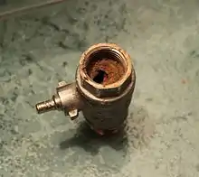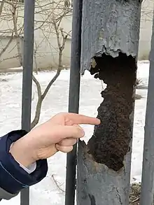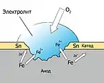 Коррозия металлов — разрушение металлов вследствие химического или электрохимического взаимодействия их с коррозионной средой[3]. Для процесса коррозии следует применять термин «коррозионный процесс», а для результата процесса — «коррозионное разрушение».