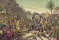 В Великий четверг 1519 года экспедиция Кортеса высадилась в гавани Сан-Хуан-де-Улуа, открытой Грихальвой. На Пасху прибыл наместник данной области (кальпишки) — Тендиль. Испанцы отслужили перед ним торжественную мессу, после чего Кортес выразил желание встретиться с Монтесумой — правителем ацтеков. Просьба была подкреплена военным парадом, на котором лейтенант Альварадо показал искусство вольтижировки, а также был дан артиллерийский салют[43]. Среди даров, отправленных испанцами Монтесуме, был испанский шлем с позолотой. Берналь Диас и другие испанские хронисты утверждали, что индейцы нашли его похожим на головной убор бога войны Уицилопочтли. По испанским сообщениям, Монтесума, увидев шлем, убедился, что испанцы являются посланцами бога Кецалькоатля, которые должны прийти с моря и овладеть страной[44]. Современные исследователи полагают, что этот миф был сочинён самими испанцами уже после покорения Мексики для идеологического обоснования завоеваний[45][46][Прим 5].