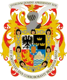 Оригинальный текст (исп.)[показатьскрыть]...Traher por vuestras armas propias y conocidas un escudo que en el medio del a la mano derecha en la parte de arriba aya una aguila negra de doss cabezas en campo blanco que son las armas de nuestro ymperio y en la otra meitad del dicho medio escudo a la parte de abaxo un leon dorado en campo colorado en memoria que vos el dicho hernando cortes y por vuestra yndustria y esfuerzo truxistes las cosas al estado arriba dicho y en la meytad del otro medio escudo de la mano yzquierda a la parte de arriba tress coronas de oro en campo negro launa sobre las dos en memoria de tress Señores de la gran ciudad de tenustitan y sus provincias que vos vencistes que fue el primero muteccuma que fue muerto por los yndios temendole vos preso y cuetaoacin su hermano que sucedio en el señorio y se rrevelo contra nos y os echo de la dicha cibdad y el otro que sucedio en el dicho señorio guauctemncin y sostubo la dicha rrevelion hasta que vos le vencistes y prendistes y en la otra meytad del dicho medio escudo de la mano yzquierda a la parte de abaxo podais traher la cibdad de tenustitan armada sobre agua en memoria que por fuerza de armas la ganastes y sujetastes a nuestro señorio y por orla del dicho escudo en campo amarillo siete capitanes y señores de siete provincias y poblaciones que estan en laguna y en torno della que se rrevelaron contra nos y los enastes y prendistes en la dicha cibdad de tenustitan apresionados y atados con una cadena que se venga a cerrar con un candado debaxo del dicho escudo y encima del un yelmo cerrado con su tinble en un escudo atal...[115]